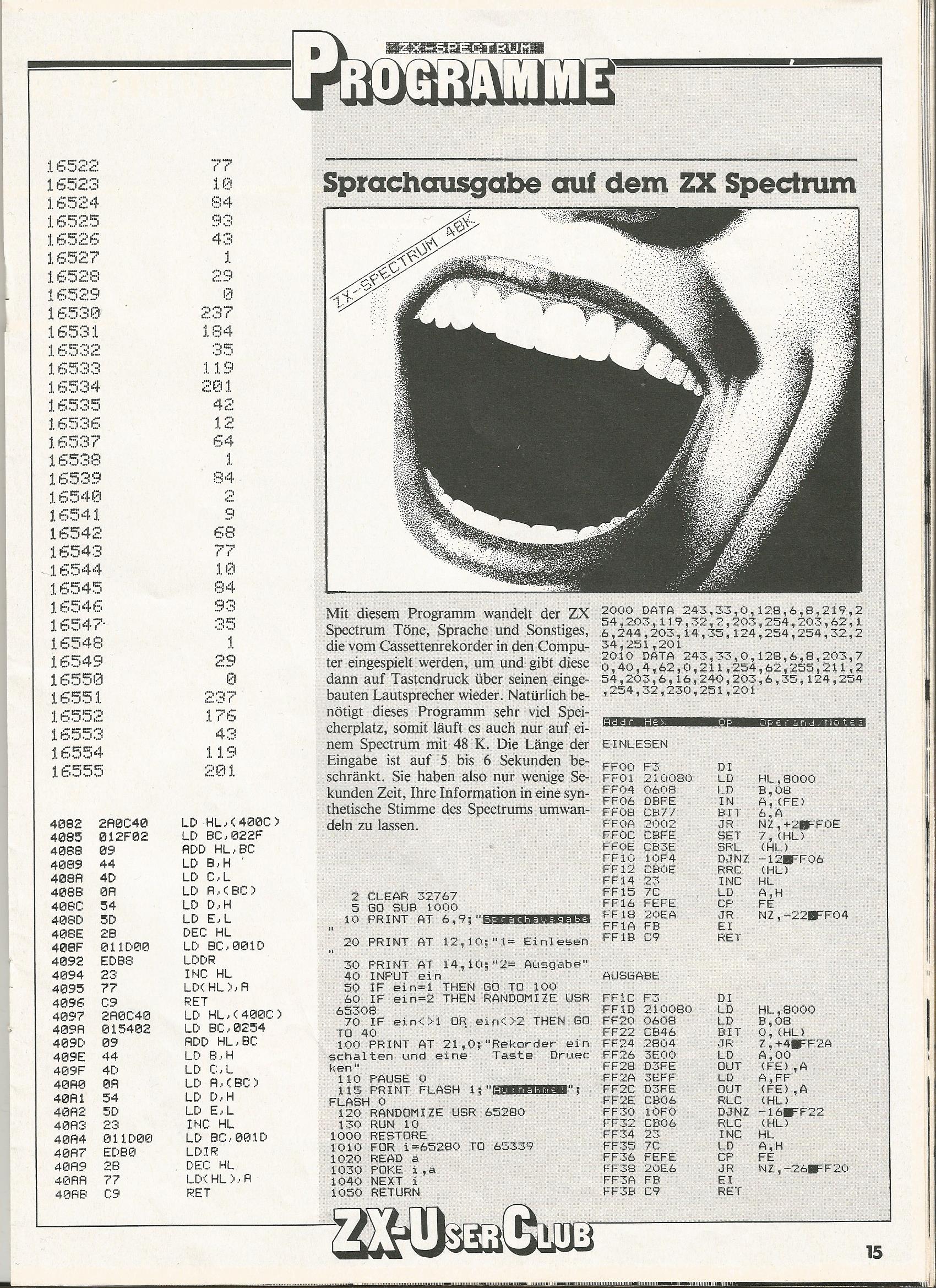 Hier mal ein Listing für Sprachausgabe auf dem Spectrum - aus der "ZX User-Club" Sept./Okt. 1983. Die Zeitschrift hatte ich mir mal vor etlichen Jahren bei Ebay besorgt.