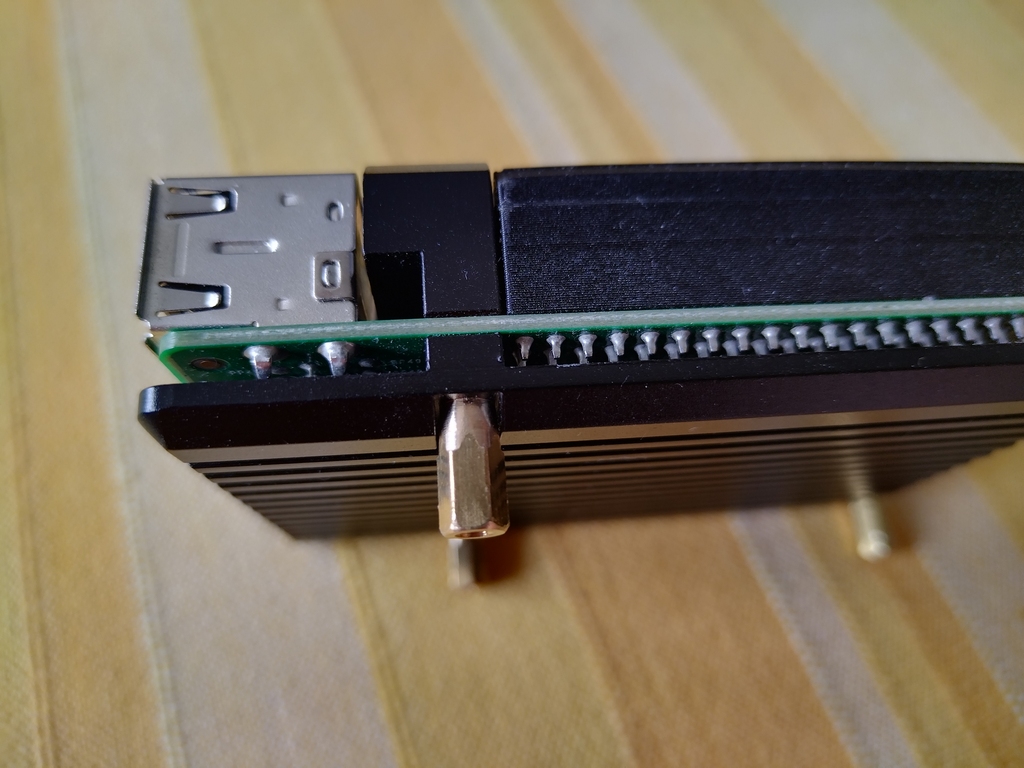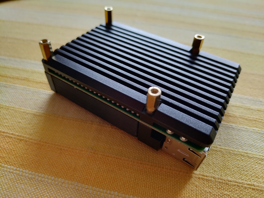 Da ich grade fleißig beim 3D-Drucken bin hab ich für meine kleinen Serverchen eine Wechselhalterung konstruiert. Ich benutze derzeit zwei Raspberry Pi 3B/3B+ für experimentelle Serveraktivitäten wie Freedombox und OpenHab sowie einen Banana Pi M2+ Education als Pi-Hole. Einer der 3er dient ab und an auch als Travelrouter mit OpenWRT als Software und muß dann mit auf Reisen. Die Halter sind hauptsächlich für die Raspberry Pi 2, 3 und 4 geeignet. Meine beiden 3er haben Armor Kühlrippengehäuse ohne Lüfter (wartungsfrei). Um diese Gehäuse mit dem mobilen Teil der Halterung zu verbinden benutze ich 6kant Abstandshalter mit Innengewinde. In das Armor Gehäuseoberteil werden 16mm lange Gewindestängchen eingeschraubt, Das Oberteil wird auf dem Raspberry mit den Wärmeübertragungsplättchen gesteckt. Dann das Unterteil mit dem Wärmeübertragungsplättchen auf der Unterseite des Pi platziert und alles mit den Abstandshaltern verschraubt. Die Abstandshalter an dem Ende mit den USB- und Ethernet Buchsen müssen vorher an einem Ende rundgefeilt werden damit sie in die Nut des unteren Kühlbleches passen. Das ganze wird dann an den mobilen Teil der Halterung geschraubt. Das Mobilteil kann dann in den fixen Teil geschoben werden. Der fixe Teil kann vorher z.B. an ein Regalbrett geschraubt werden. Um das Mobilteil einzuschieben oder herauszuziehen muß die Lasche in der Mitte etwas (1,5mm) angehoben werden, damit die Nase an der Lasche aus der Vertiefung herausgehoben wird.