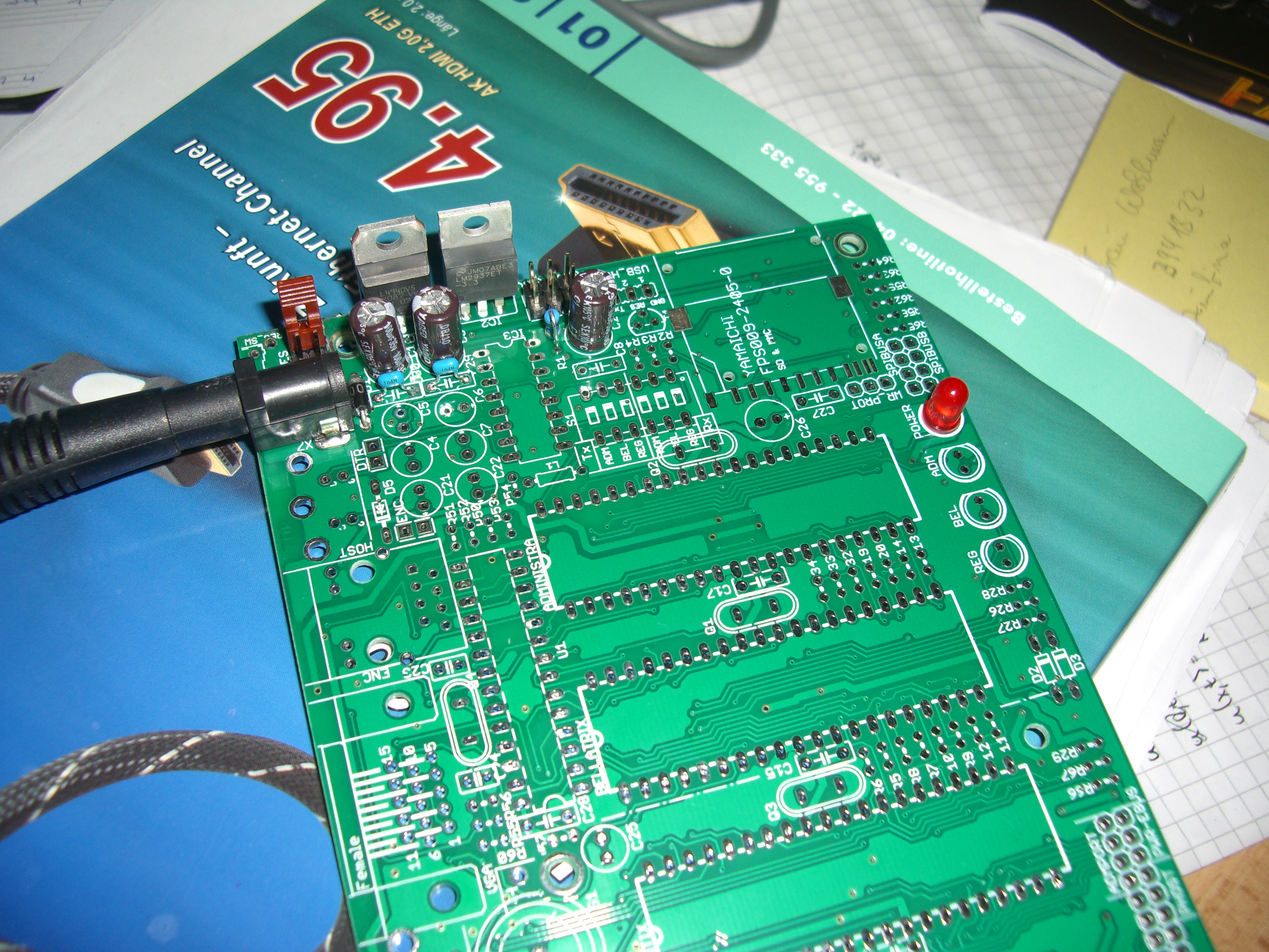 Bisher lief alles sehr gut. Erste Erfolgserlebnisse stellten sich ein, als ich die richtigen Spannungen messen konnte und dann am Ende doch glatt die PowerLED leuchtete. Okay, es ist keine große Kunst eine LED zum Leuchten zu bringen, dennoch bin ich vor Freude durch die Gegend gehüpft.