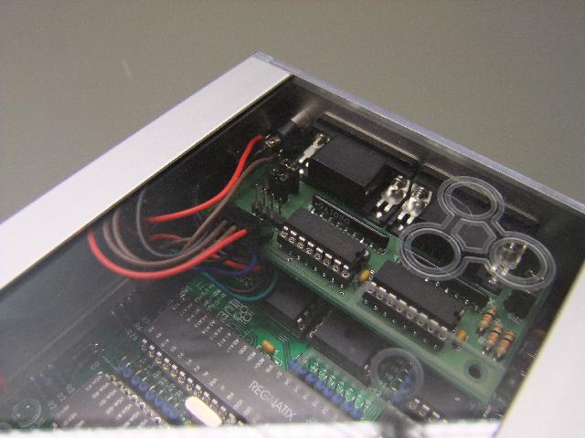 Nachdem ich von blueicechip eine Mini-Joystick-Karte bekommen habe (vielen Dank nochmal!), habe ich diese nun endlich in den Hive 360 integriert. Dazu habe ich bei Schaeffer eine neue Seitenwand bestellt. An diese wurde die Mini-Joystick-Karte mit den Sub-D-Steckern befestigt und eine Klinkenbuchse zum Anschluß des DCF77-Moduls angebracht. Außerdem ist ein Durchbruch für das Bluetooth-Modul vorhanden, welches hier eingeklebt wurde. DCF77- und Bluetooth-Modul wurden entsprechend der Plexus-Dokumentation angeschlossen, sind also mit Plexus und für eigene Experimente nutzbar.